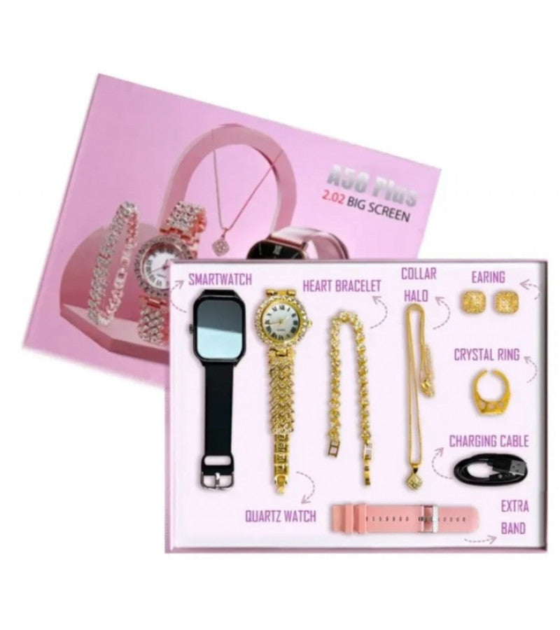 - and style. This special set is made for the modern woman who loves both fashion and functionality. The A58 Plus Smartwatch has a sleek design and offers smart features like fitness tracking and notifications, making it an ideal accessory for everyday use. The set also includes beautiful jewelry, making it a great gift for any occasion. With the A58 Plus Smartwatch, you get the best of both worlds—elegance and advanced smartwatch technology.
